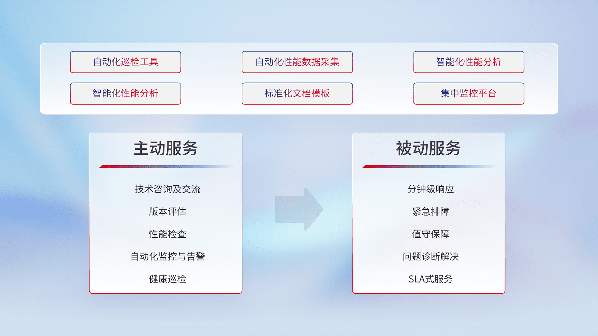 智能化工具和标准化文档,,,保障服务质量,,,,提供主动服务(包含技术咨询、、、、版本评估、、性能检查、、自动化监控与告警、、、、健康巡检)和被动服务包含(分钟级响应、、、紧急排障、、值守保障、、、问题诊断解决、、、、SLA服务)。。。
