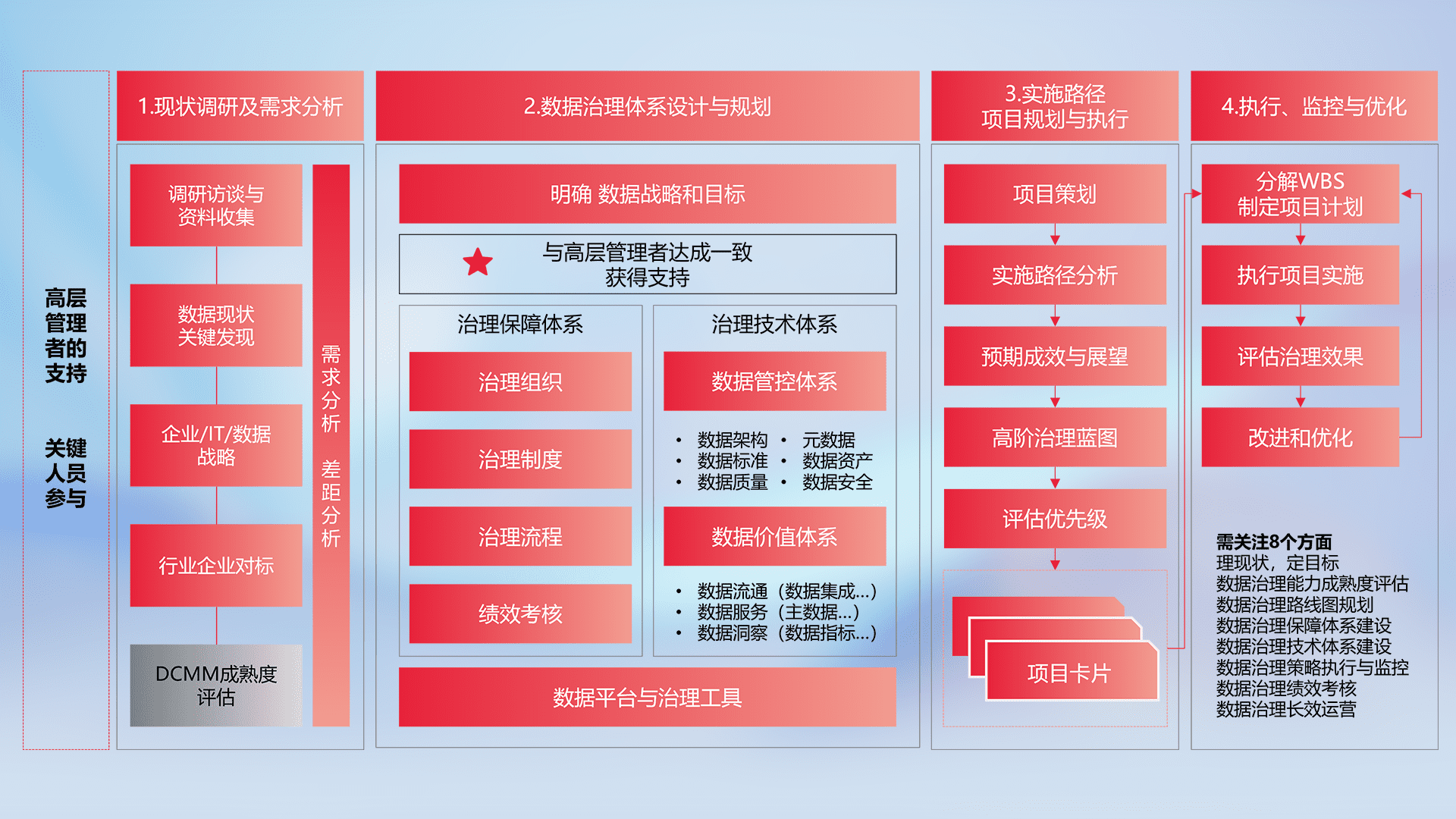 制定并执行统一的数据标准,,,,规范数据定义和格式,,,消除冗余和不一致性,,,实现跨部门和跨系统的数据一致性,,,为企业提供标准化的数据基础。。。